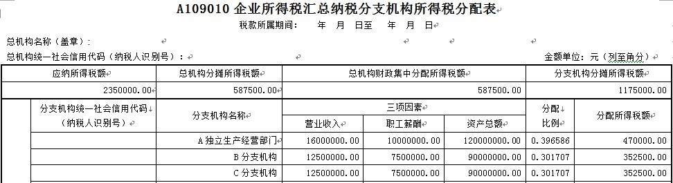 2. 应填报A109000跨地区经营汇总纳税企业年度分摊企业所得税明细表、A109010 企业所得税汇总纳税分支机构所得税分配表。